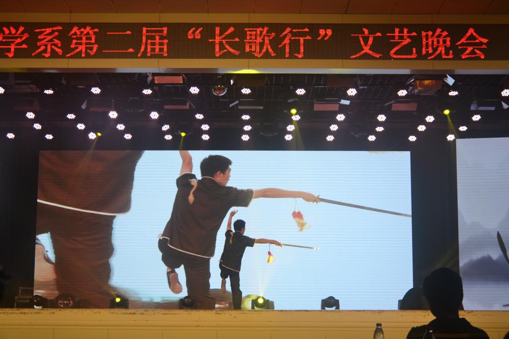 随后,晚会分为四个篇章。第一篇章?/span>青青园中?/span>?/span>展示了法医学子的青春和活力。由15级本科生带来的民舞《床前明月光》以柔美的舞姿和灵动的舞步讲述着诗意般的故事,缓缓而来、意味深远;小品《廉价航空》笑点满满,于诙谐中给观众带来了快乐;?/span>16级本科生献上传统武术表演《盗宝》,用舞剑和对打的设计传递出青春的刚毅和力量美感。贯穿全场的黑衣人盗宝案件成为晚会的故事主线,引来名侦探柯南、毛利小五郎、包公和展昭等作为主持人参与案件调查,推动晚会进行?/span>